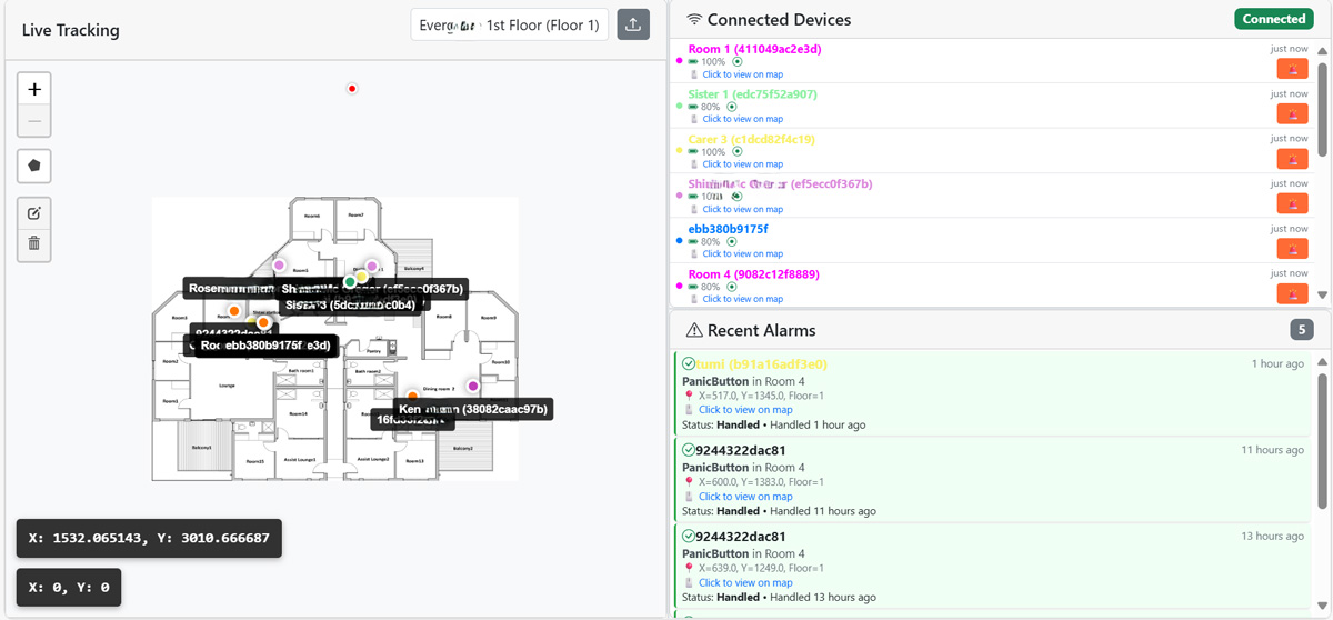 - Spoken alerts with exact location and resident ID